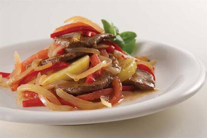 Caliente y con carne de vaca. Unos bifes de lomo mezclados con cebollas, tomates perita, ajíes rojos y verdes. Sencillo, no tan pesado y rico para compartir la noche en cuestión.