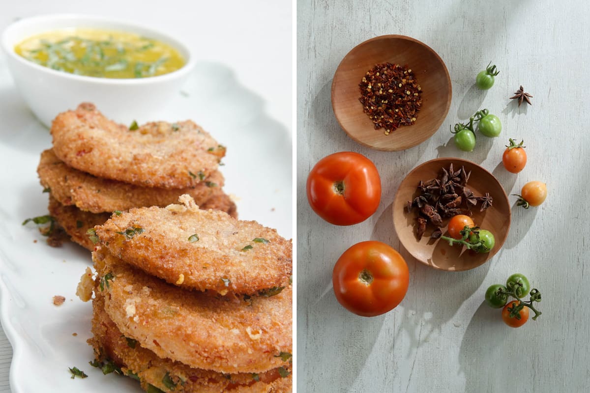 Cortar los tomates verdes en rebanadas de 1 cm de grosor. Pasarlas primero por harina, luego por huevo batido con ½ cucharita de agua por cada huevo y por una mezcla de pan rallado, queso rallado, orégano molido o albahaca picada, y una pizca de ají. Saltear en aceite de oliva hasta que estén dorados. Se sirven tibios con una salsa aioli. Salsa aioli: Procesar el ajo con las yemas y el jugo del limón. Gota por gota, echar el aceite hasta lograr una emulsión. Agregar hierbas picadas (como albahaca, ciboulette, cilantro o estragón) y las anchoas picadas.