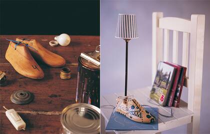 Después de haber lijado una vieja horma de zapatos, la pintamos inspirándonos en una antigua colección de muebles de estilo francés. Para protegerla antes de que empezara a cumplir su nueva función de base de lámpara, bastó con lustrarla. Completa la propuesta de moderno contraste una pantallita entelada con género a rayas (Bomboniera).