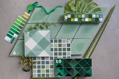 6. Revestimiento romboidal de cemento ‘Estocolmo’ ($500 el m2, Bará Revestimientos). 7. Calcáreo cuadrillé ($1.600 el m2, hasta con tres colores, Categoría 7). 8. Malla ‘Dune’ de 29x29cm ($262, Altea). 9. Cerámica ‘Kubic’ con tonos menta y grises de 30x30 ($704, Ramos Revestimientos). 10. Plancha ‘Origami Green’ ($495 c/u, Ostakia).