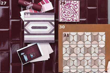 27. Azulejo tipo ‘subway tile’ biselado de 7x15cm ($1.560 el m2, Carabath). 28. Mosaico calcáreo ($1.600 el m2 hasta 3 colores, Categoría 7). 29. Guarda inglesa ($150 el m2, Carabath). 30. Micro-revestimiento para pisos ‘Baxab’ ($700 el m2, Topcret). 31. Revestimiento en plancha ‘Marmi Pop’ ($833,34, Ostakia).