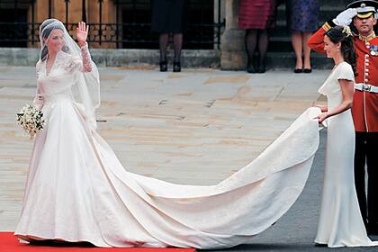 2011. Romántico y elegante, el vestido de novia de Catherine Middleton fue creado por Sarah Burton, jefa de diseño de la casa Alexander McQueen. De raso marfil y adornado con encaje de aplique hecho a mano, se modernizó con el drapeado en la espalda