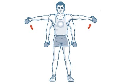 De pie, subir y bajar los brazos extendidos sosteniendo una pesa de entre 3 y 4 kilos en cada mano. Subir hasta la altura de los hombros cuidando de no quebrar las muñecas. Realizar 3 series de 20 repeticiones.