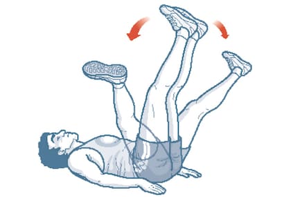 Acostado, con las piernas extendidas y levantadas formando un ángulo de 90 grados con el torso si es posible; abrir y cerrar las piernas. Se pueden agregar tobilleras de 1 o 2 kilos en cada pie. Realizar 3 series de 30 repeticiones.