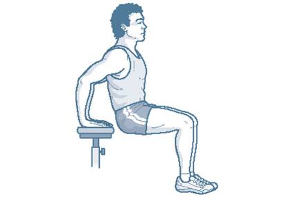 Con las manos apoyadas sobre un banco, flexionar y extender los brazos cuidando de que los codos miren siempre hacia atrás y no se abran. Mantener el torso alineado y no ayudarse con la cadera. Realizar 3 series de 15 a 20 repeticiones.
