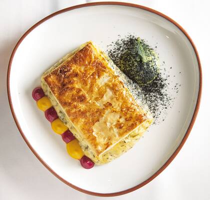 Entre lo mas alimenticio y típico sobresale moussaka, lasagna de berenjenas, carne y tomate (300) y pasha borek de masa filo rellena de queso, emulsión de verdes y polvo de vegetales asados (300, tal vez la receta más actual de Steven). La trucha y el cordero llegan de la Patagonia, buena la primera con trigo burgol y emulsión de arvejas y menta –lo más novedoso–. El sofisticado cordero llega braseado 6 horas con higos negros, pasas y nueces (340). De ternera, los tan típicos shish kebab con hanout y menta (320). El pan pita de la casa acompaña muy bien.