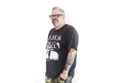 Tenía la idea de hacerme el brazo de Basil Gogos, el dibujante de las tapas de la revista Famous Monsters. Me gustaban sus dibujos. Tengo un libro de él e iba pensando cuáles podían ir. Para no arrepentirme, me los fui haciendo de abajo hacia arriba. Empecé a subir desde de la mano, así me obligaba a hacerlos. Si arrancás la manga desde el hombro para abajo, capaz que llegás hasta donde se termina la remera y parás. Tardé dos años en completarlo, pero arranqué ya de grande, a los 30. Uno piensa que se va a arrepentir de los tatuajes, pero si a los 30 te arrepentís de algo ya sos medio boludo. Fue un poco lo mismo que me tatué a los 18 en el fondo, así que, evidentemente, era lo que me interesaba.