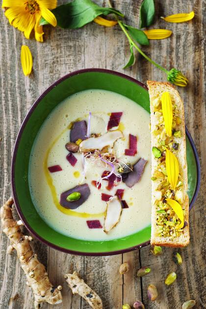 Es originario del Amazonas y se fue extendiendo hacia América del Norte. Los franceses lo llevaron a Europa y lo llamaron topinambour, por la tribu de indios americanos Tupinambos. Se usó para alimentar animales y para jardines, por sus flores. Pero tiene muchísimas propiedades nutritivas: ayuda a los enfermos de diabetes, baja el colesterol, es apto para celíacos, aporta vitaminas y minerales. Y es rico y muy versátil a la hora de cocinarlo, que es lo que más me interesa a mí.