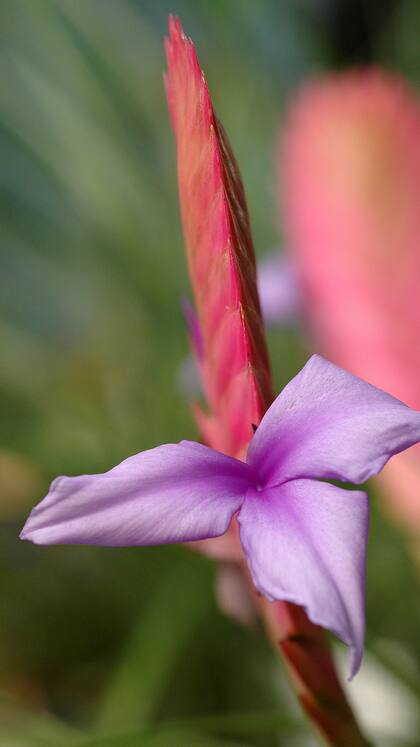 - Entre las exóticas hay dos que se pueden conseguir en los viveros como plantas de interior y son nativas de la América tropical: la T. flabellata, de inflorescencias ramificadas rojas y roseta verde, y la T. cyanea y sus híbridos, con hojas angostas y largas e inflorescencias chatas y anchas, con brácteas rosas y flores violáceas. Ambas necesitan buena humedad para crecer bien, no tienen las adaptaciones de las tillandsias de follaje gris.