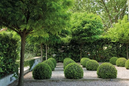 Suele aportar una inmediata sensación de armonía, tal es el caso de esta simétrica disposición de bochas de buxus, que invitan a reposar la mirada y proyectan un aspecto calmo y ordenado. El diseño tiene una función más contemplativa que funcional.
