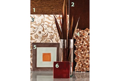 1› Baldosa de cerámica símil madera de 11x44cm (Blaisten). 2› Revestimiento rectificado símil cuero de 30x58cm de la marca San Lorenzo ($150 el m2, Barugel Azulay). 3› Cerámico ‘Sinfonía’ de 40x40cm de la colección Le Patio, exclusiva de Batyco ($223 c/u, Batyco). 4› Plancha de semillas de metal color cobre de 30x30cm ($250 c/u, Carabath). 5› Mosaico calcáreo de 20x20cm pintado con estilo moderno ($50 c/u, El Escarabajo). 6› Taco cerámico de 10x10cm ($15 c/u, El Escarabajo).