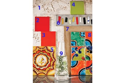 1› Travertino natural ($350 el m2, Batyco). 2, 3 y 4› Taco cerámico de 10x10cm ($15 c/u, El Escarabajo). 5› Cerámico pintado a mano de 20x20cm ($60 c/u, Deco). 6› Guarda volcánica de 8x30cm con incrustaciones de cerámicos antiguos ($25 c/u, El Escarabajo). 7› Piso de cerámica Alberdi ‘Cementi’ de 34x34cm ($59 el m2, Fedan). 8› Panel artístico de 30x30cm ($210 o $24 cada taco de 10x10cm, Carabath). 9› Botella de vidrio.