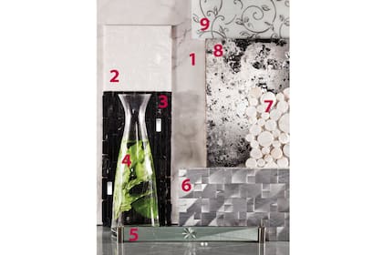 1› Porcelanato ‘Calacata’ de 30x60cm ($146 el m2, Batyco). 2› Azulejo blanco con relieve de 15x15cm ($15, c/u, Deco). 3› Revestimiento ‘Marquina’ de 31x31cm, de piedra negra con aplicaciones cromadas ($131 c/u, Barugel Azulay). 4› Botellón de vidrio (Karina Arc). 5› Guarda ‘Cuadretti’ de 3x30cm, de espejo y cromo ($277 el metro lineal, Barugel Azulay). 6› Revestimiento ‘Kubic’ de 30x30cm, de aluminio con efecto 3D ($197 c/u, Barugel Azulay). 7› Panel de círculos nacarados ($40 la plancha de 30x30cm, Carabath). 8› Travertino plateado a la hoja de 30 o 40cm por largo libre ($1.424 el m2, Batyco). 9› Panel de vidrio pintado ($190 el metro lineal, Carabath).