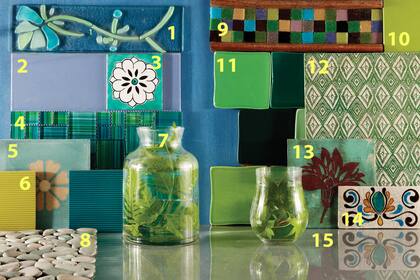 1› Guarda de vidrio con aplicaciones de 30x8cm ($60 c/u, El Escarabajo). 2› Cerámico esmaltado artesanalmente de 30x30cm ($400 el m2, El Escarabajo). 3› Taco cerámico de 10x10cm con roseta ($28 c/u, Carabath). 4› Plancha de venecitas de vidrio de 30x30cm ($107 c/u, BarugelAzulay). 5› Taco calcáreo de 15x15cm con flor ($20 c/u, El Escarabajo). 6› Toceto con textura 10x10cm en dos colores ($6 c/u, BarugelAzulay). 7› Botellón de vidrio (Acento). 8› Piedra natural en planchas de 30x30cm ($50 c/u, Batyco). 9› Guarda de venecitas combinada con marco de madera ($180 el metro, Carabath). 10› Silestone a medida (precio según diseño, Batyco). 11› Taco cerámico de 10x10cm en varios tonos de verde ($500 el m2, Carabath). 12› Cerámico ‘Opus’ de 30x30cm, de la colección ‘Le Patio’, ($125 c/u, Batyco). 13› Taco de cerámica de 15x15cm pintado con técnica marroquí ($25 c/u, El Escarabajo). 14› Guarda de cerámica ‘Salamanca’ ($210 el metro lineal, Carabath). 15› Vidrio de 4mm de espesor ($130 el m2, Linpas).