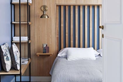 Cuatro meses trabajaron el arquitecto Alejo Petrucci y el diseñador gráfico Francisco Miranda (creador de Tooco) para reformar una tradicional oficina de los años 40 en el Microcentro, transformándola en una luminosa vivienda. En el cuarto generaron un original respaldo. Sobre un fondo azul colocaron tablas de madera que hacen pensar en los viejos elásticos, un efecto genial que a la noche se refuerza con una cinta de luces led. El espacio gana sobriedad con el revestimiento es de madera de kiri (Tooco) y los artefactos de bronce cepillado.