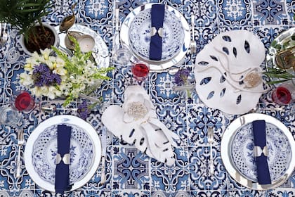 La unión azul y blanco le saca ventaja la clásico black & white cuando se trata de ambientar celebraciones hasta bien entrado el maravilloso otoño. En este caso, un mantel con estampado sensacional sirve como base para la mesa armada con toques metalizados, flores frescas y servilletas en colores plenos. Detalles sencillos y eficaces que forman un conjunto irresistible.