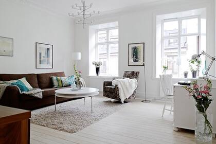 El sofá color chocolate se transforma en el punto focal de este living a puro blanco. | Foto: