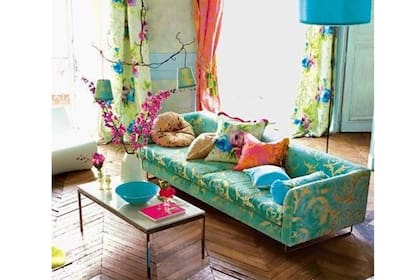 El tapizado estampado del sillón contrasta con los distintos colores de los almohadones en este ambiente lleno de luz y tonos brillantes. | Foto: