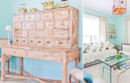 la característica del cobre es su color amarillento. Recordemos las típicas cacerolas tan lindas y decorativas. Acá se desplegaron candelabros de diferentes tamaños y modelos en una repisa y, sobre una cajonera, una colección de pavas del mismo tono. Combinado con los tonos claros de celestes y grises, se consigue un buen equilibrio entre la calidez y la frescura.
