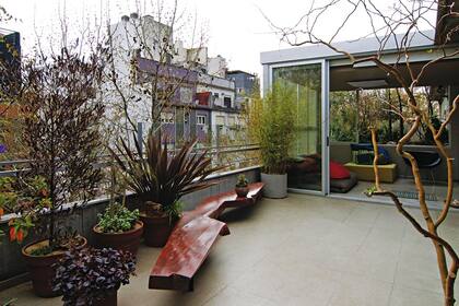 Banco largo: casi escultural, este tronco se extiende sobre la terraza; para que se pueda mantener así de brillante a la intemperie se puede proteger con una pintura especial.