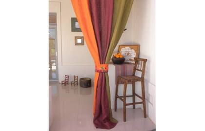 Una cortina realizada con tres colores de género y agarradas con una pasamanería de lo mismo.