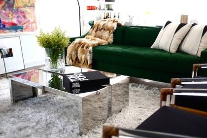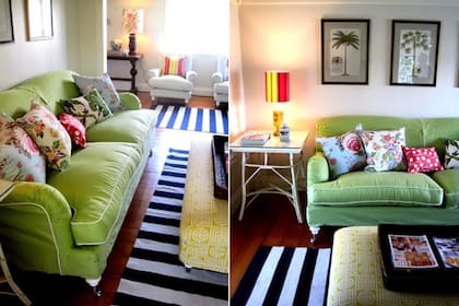 Un verde inglés intenso para un sofá de líneas modernas en un living con decoración ecléctica. | Foto: Parlourhimeblog