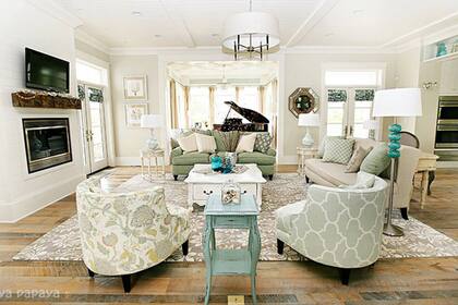 Una paleta de verdes pastel juega en los distintos asientos de esta sala: flores, tonos plenos y dibujos bien elegidos y en armonía. | Foto: Houseofturquoise