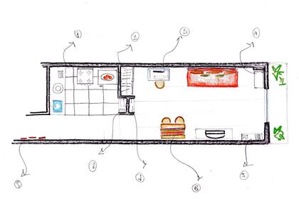 En principio, me gustó la distribución planteada por lailocha . Compartieron la idea de generar un mueble divisorio con vivi1968 , quien nos decía: "Me jugaría por un mueble divisor, que haga las veces de pared del lado de la cocina y de placard del lado del dormitorio, en melamina blanca (bien lavable)…".
