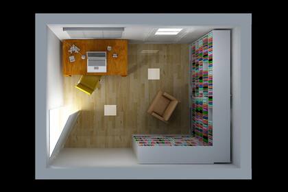 Me pareció, viendo dentro de esta distribución, muy apropiada la opción de utilizar un sillón de un cuerpo que cumpla las funciones de cama-sillón de lectura, exprimiendo el espacio al máximo.