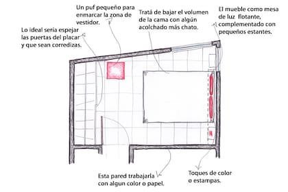 ¿Qué debemos tener en cuenta cuando tenemos un cuarto con estas características y necesitamos elementos indispensables? Elegir una cama baja es la primera consigna; así generamos menos volumen dentro del espacio. En segundo lugar, los acolchados y edredones llenan mucho, entonces es conveniente optar modelos más planos, en colores plenos. La mejor elección son los tonos neutros y sumar acentos de color, por ejemplo, en almohadones (no más de dos y en un tamaño de, como mucho, 50x50cm. Si queremos que sean más debemos bajar la medida.