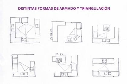 Hay tres elementos fundamentales en este lugar: la ubicación de la/las bacha/s, la cocina propiamente dicha y la heladera. Esto se denomina triangulación e indica que debería haber una línea imaginaria entre los instrumentos de trabajo y que conexión marcará el proceso de los alimentos: sacar lo que necesitamos de la heladera, lavarlo y cocinarlo.