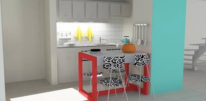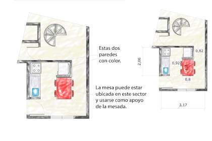 Respecto al color para la pared, Vivi1968 decía: "Del lado del living la pintaría colorida o bien la empapelaría con algún diseño copado." El darle color solo a la cara del frente y al lateral paralelo a la heladera hará que el interior, en blanco, se integre más con el resto de la cocina. También se podría utilizar el muro contiguo a la mesa para ubicar cosas que se necesiten para cocinar.