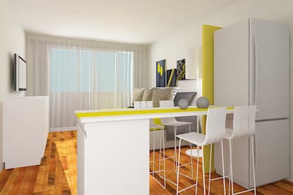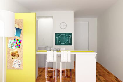 * El antiguo mueble que funcionaba como apoyo para cocinar convertilo en "pata" de la barra. Para acceder con facilidad al espacio de guardado, colocá el lado de la puerta del lado de la circulación. En cuanto a la tapa, podría hacerse en base a la idea de SieSparatanto: "Podés cortar la tabla de tu mesa actual o comprarte una tabla de 60x75 (y los tapacantos, les pasás la plancha, apretás y listo)". Aquí la barra será la protagonista de múltiples funciones: cocinar, estudiar, e incluso, usar una laptop. Entonces va a ser importante que la complementes con cuatro banquetas bien cómodas.