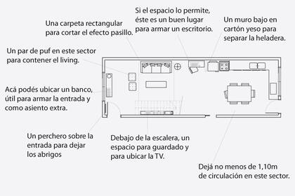 La forma rectangular de la planta más la escalera y los dos muebles hacen que un espacio pensado como una planta libre y fluida se vea encajonado y con pocas alternativas para la distribución. Entonces es difícil que resulte amplio y cómodo.