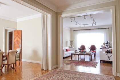 Estar en "L" || Se podría dividir en dos partes. Por un lado, un área social más cercana al hall de acceso, súper funcional para recibir amigos y para reuniones, incluyendo un sillón de dos cuerpos más los de un cuerpo rayados, una mesa ratona (al ser un espacio alargado, lo ideal es tenga una forma rectangular -1.20x 0.60m aprox.), y el bar entre la arcada y la ventana, en el espacio que hoy ocupa el mueble secretaire. Sobre la otra parte de la "L" mas acotada el área de TV. Debería estar equipado con un cómodo sillón de dos cuerpos y una mesa ratona como apoyo para que permita disfrutar de una película en familia.