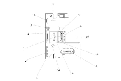 1. Esta pared en tono gris; 2. Una biblioteca o un vajillero; 3. Una lámpara de techo marcando el centro; 4. Un mueble bajo como apoyo de la TV; 5. Una lámpara de pie para marcar el límite del living; 6. Una consola, un perchero de pie y un espejo; 7. Un riel para articular la iluminación sobre este sector; 8. El sillón con funda en este lugar; 9. Uno o dos estantes para darle volumen a la pared; 10. Una mesa alargada y de estilo industrial para que no entorpezca la circulación; 11. Si la estructura lo permite, una abertura sobre este muro; 12. Tres luminarias para darle dinamismo al comedor; 13. Una carpeta para enmarcar el espacio; 14. El puf con una funda como la del sillón.