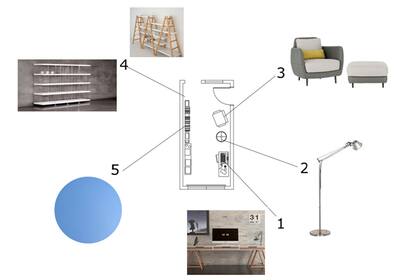 REFERENCIAS: 1. Acá, el escritorio ubicado en forma perpendicular a la entrada de luz. | 2. El sector de lectura con una lámpara de apoyo. | 3.Un sillón de un cuerpo. | 4. Sobre esta pared, una o más líneas de estantes flotantes. | 5. Esta pared podrá dar el toque de color aprovechado que es un espacio muy luminoso.