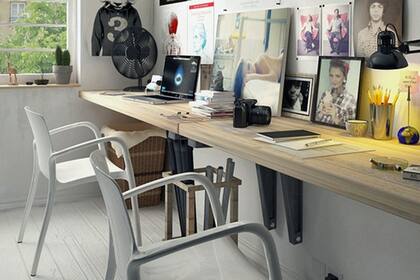 - Sobre la pared opuesta al sector de trabajo, algunas filas de estantes (flotantes o con ménsulas). Lo ideal es que no lleguen a los bordes del espacio para no sobrecargarlo visualmente. Con la misma idea habrá que evitar el uso de un mueble cerrado que lo afinaría más.