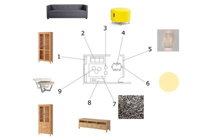 Referencias: Sobre los laterales, dos muebles para guardado. | 2. Un sillón de tres cuerpos en un tono neutro. | 3. Acá, un par de pufs. | 4. La mesa del comedor perpendicular a la pared, para liberar el muro. | 5. Un par de apliques de pared para generar una luz ambiental. | 6. Esta pared como detalle de color. | 7. Una carpeta en gris claro para enmarcar e iluminar el living. | 8. Un mueble bajo para la TV. | 9. Tres mesas circulares para darle movimiento al estar.