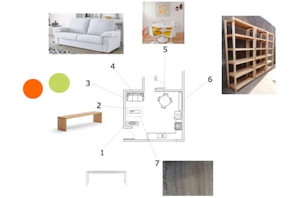 Referencias: 1. La mesa de TV de acuerdo a la escala de la pared. | 2. La mesa ratona debe combinar diseño y funcionalidad. | 3. Para la pared, algún color intenso (podría ser un verde lima -si se busca un color frio- o algún naranja intenso -si se busca algún que sea cálido-). | 4- El sillón del living que sea cómodo y mullido, y que incluya almohadones para darle mayor sensación de confort. | 5. La mesa redonda con un diámetro que se adapte al espacio disponible. | 6. Sobre este muro, un mueble bajo o alto, dependiendo de las necesidades. | 7. Una alfombra para ayudar a definir mejor el espacio.