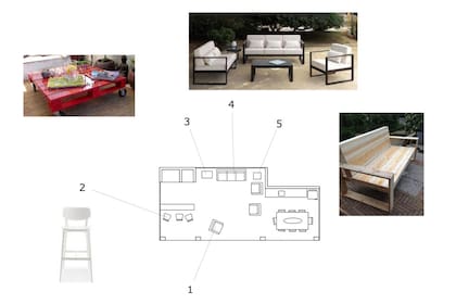 REFERENCIAS: 1. Apostá a un sillón de tres cuerpos y un par de un cuerpo que dan un resultado más articulado. Como principal característica que todas las piezas sean de fácil mantenimiento, en color neutro y en concordancia con el diseño de la mesa. | 2. Las banquetas también de estilo neutro y contemporáneo. | 3 y 5. Un par de mesas con ruedas para que su uso sea más articulado.| 4. Como opción, algún detalle rustico para los sillones.