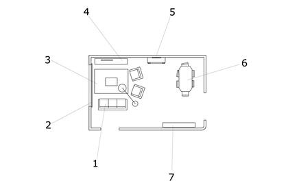 REFERENCIAS: 1. El living rotado 90° para aggiornar los sillones, fundas en composición con el tono del nuevo tapizado de las sillas. | 2. Una cortina tipo roller o panel oriental. | 3. Una alfombra para enmarcar el espacio. | 4. Un rack de TV que ocupe todo el largo del living y sea útil también como lugar de guardado extra. | 5. Para enmarcar el hogar, ubicaría sobre él el cuadro que está en el living y pintaría la pared en el mismo tono que las otras. | 6. La mesa del living rotada 90°. | 7. Acá, algunos estantes flotantes para ubicar los objetos seleccionados. También puede ser un opcional para evitar el uso de una barra de tragos y sumar los elementos que sean necesarios.