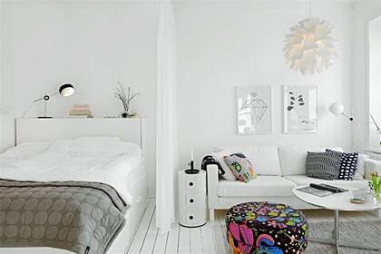 3. Separá los sectores solo de manera virtual. En el dormitorio se podría ubicar una alfombra debajo de la cama que lo delimite a nivel del suelo y un estante flotante como límite volumétrico (teniendo la precaución que sea un poco más largo que la cama). También serviría como mesa de luz aérea. El living se podría plantear como una zona de relax, equipándolo con un sillón de un cuerpo y un apoyapiés. Como la cama es de gran tamaño es incompatible sumar un sillón de dos cuerpos. Para recibir amigos se podría utilizar la barra de la cocina que es de buenas dimensiones. Enfrentado al sillón, se podría ubicar la TV sobre el muro con un brazo articulado para que también se pueda ver desde la cama.