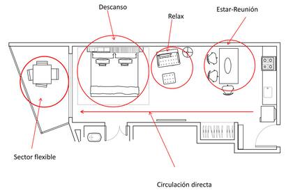 2. Prever que la circulación sea libre desde el ingreso hasta el balcón terraza. Para que el espacio resulte fluido, teniendo en cuenta también el ingreso al baño y el uso del placar queden liberados. Ubicá sobre la pared opuesta a la circulación -hacia el balcón- las "zonas estancas": cuarto mini-living y comedor.