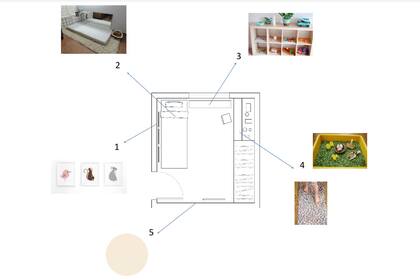 Referencias: 1. Acá, unas láminas (también pueden ir en las puertas del placard). | 2. Reemplazá la cama por otra de diseño más sencillo. | 3. Acá, el sector de guardado o el espejo. | 4. En el sector de recreación se podrá agregar el rincón de la naturaleza. | 5. Los muros en tonos neutros incorporando también el interior del placar como sector lúdico.