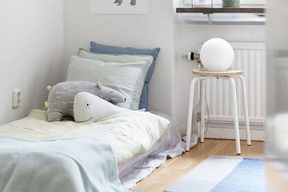 * Apostá al uso de un tono neutro para las paredes teniendo en cuenta la escala del cuarto. Por otra parte, eliminá el pizarrón verde y la guarda de papel sobre la pared.
