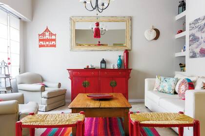 1. Ubicá el mueble rojo sobre la espalda del sillón para darle jerarquía, volumen y un detalle de color al estar.
