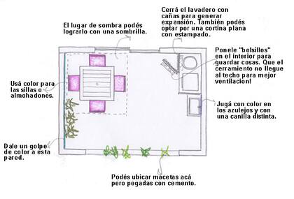Malenabal74 también hablaba del sector lavadero y opinaba: “que el frente sea como una especie de cortina para que no quede todo tan hermético, que contraste con el color de la pared. El lavadero que sea parte de la terraza, no un lugar apartado”. Lailocha nos dejó un planito para mostrar su idea.