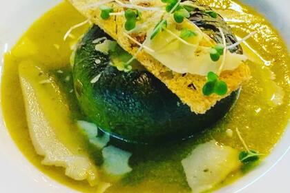 - Para servir vamos a disponer el zapallito ahuecado en el centro del plato, luego incorporaremos el caldo, disponemos unas lascas de Parmeggiano y la focaccia por encima. En caso de que quieran hacer polvo de aceitunas negras, se debe secar la aceituna y luego triturarla para tirar por encima.