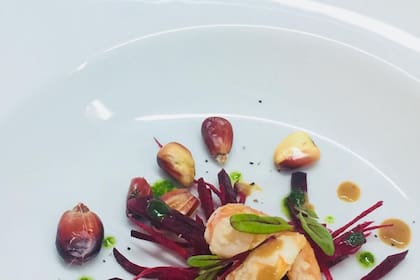 Sopa crema de remolacha con langostinos y maíz asado
